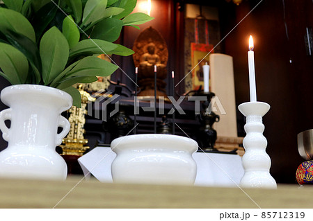 唐木仏壇に祀られた禅宗のお釈迦様の仏像と葬儀用の仏具2