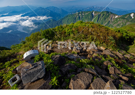 新緑の浅草岳山頂から見る鬼ヶ面山と越後三山