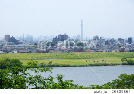 都市風景 千葉県市川市里見公園から都心を望む 東京スカイツリーと富士山