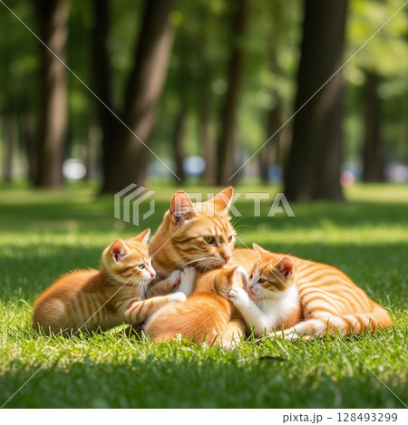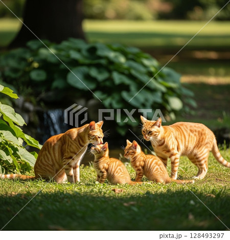 緑の公園でくつろぐ茶トラ猫の親子|穏やかな日常の風景 野良猫 日本猫 猫の習性