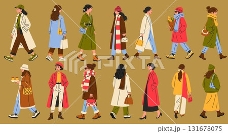 Stylish women walking in various outfits during a cool season in a vibrant urban setting