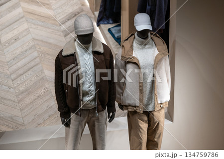 Winter Fashion Display: Two Mannequins in Neutral Tones With Jackets and Knitwear