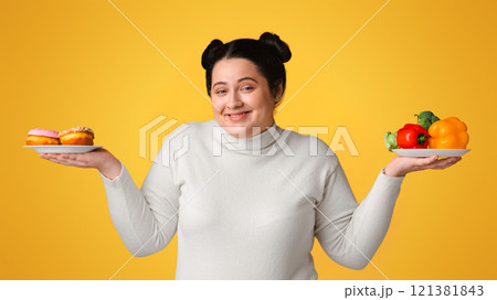 Positive plus size girl cannot decide between plates with donuts and fresh organic vegetables, standing puzzled over yellow background, panorama