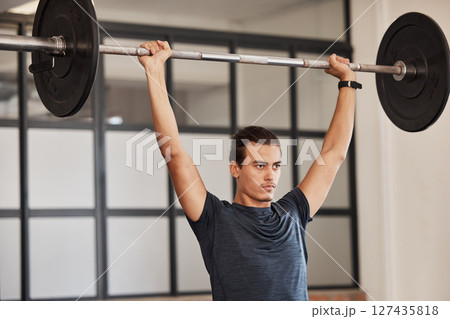 Strong man, overhead barbell and gym exercise, workout and fitness training in sports club. Young man, focus bodybuilder and power press, weightlifting challenge and muscle, motivation and energy