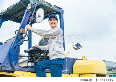 フォークリフトに乗り込む男性作業員
