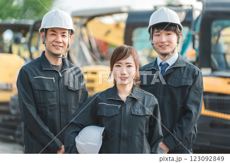 重機の前にいる作業着姿の建設業・建築業の作業員男女