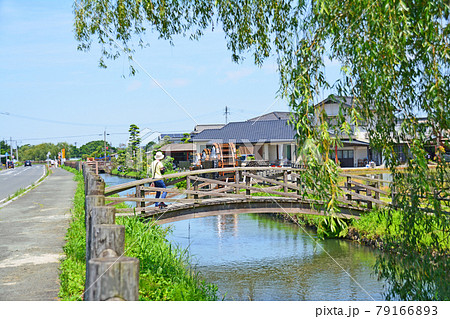 人気観光スポット朝倉市の堀川用水に架かる橋と三連水車