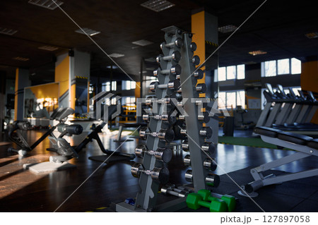 Modern gym with various equipment for training. Sports simulators and dumbbells.