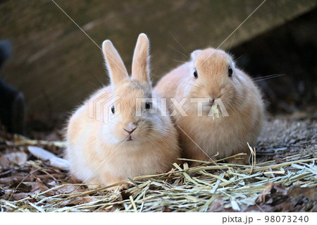 干し草を食べる仔ウサギたち
