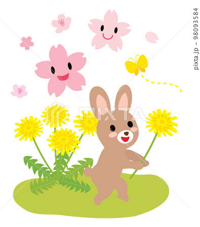 タンポポと桜とかわいいウサギ