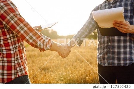 Handshake, joint work of farmers. Two farmers making agreement with handshake in wheat field.