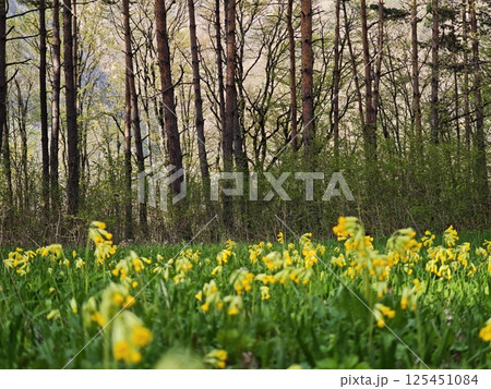 Cowslip flowers blooming in meadow near forest in spring