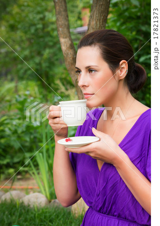Beautiful young woman drinking coffee outdoors