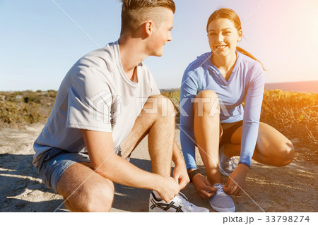 Couple of runners lace their shoes and prepare to jogging