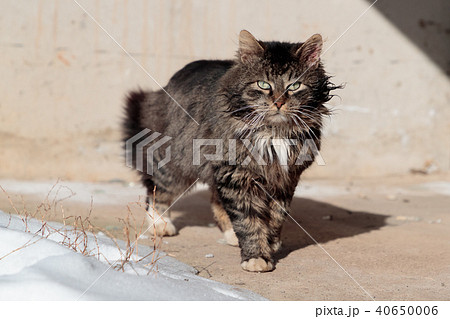 tortured and listless cat walks the ground near the snow