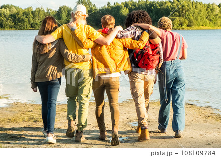 Wanderlust lifestyle, rear view of Friends Hugging by Forest Lake