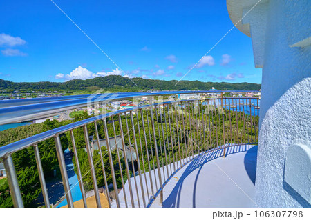 千葉県南房総市白浜の野島埼灯台の展望デッキから北側の眺望(野島漁港,野島崎公園西駐車場など)