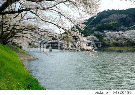 愛媛県西予市野村町肱川の川沿いに咲く桜の花とバス釣り