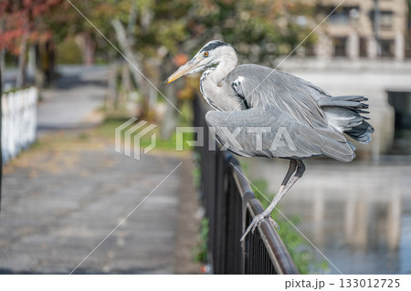 琵琶湖疏水沿いの柵の上に立つアオサギ 京都市