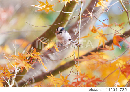 紅葉バックに流し目のエナガ