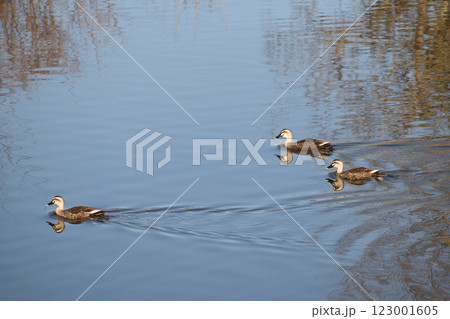 冬の川でエサを探しながら泳ぐカモ