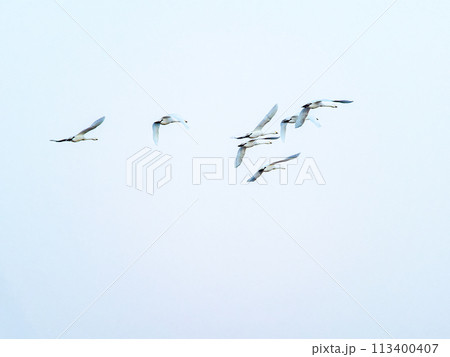 首都圏の荒川で越冬する白鳥 夕焼け空の優雅な飛翔のシルエット