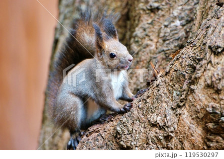 巣穴からクルミを咥えて顔を出すエゾリス
