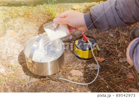 Traveler foods for outdoor activities. Camping food making. Rice in pot in the wild forest in sunny summer day.