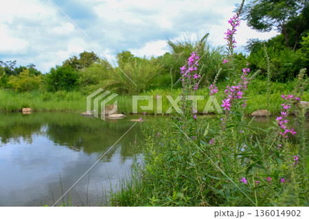Lythrum virgatum in the rural field with wild grass. Purple wild flowers in the countryside. Flower and plant.