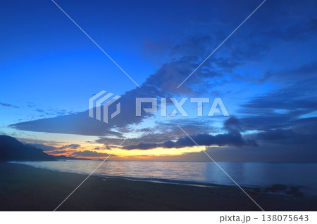 伊豆大島の冬 夕日に染まる海越しの富士の絶景