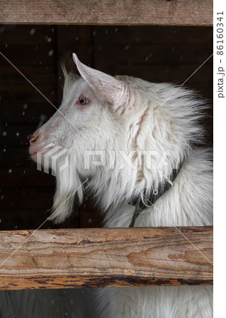 A white goat of the Zaanen breed on a dark background in the barn window. Profile photo. Concept: lifestyle, home farm, goat breeding, animal husbandry, ecological product.