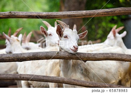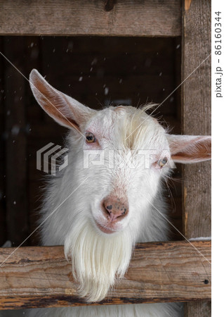 Goat breeding farm. Portrait of white goat.