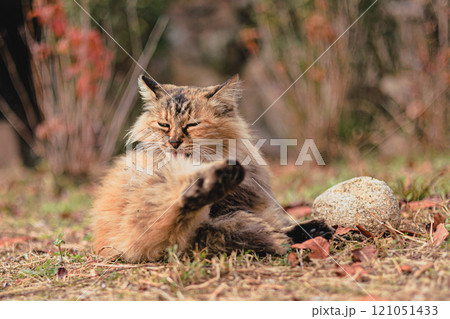 毛繕いをする三毛猫