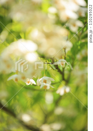 幻想的な光の玉ボケに包まれた初夏のエゴノキの白い花