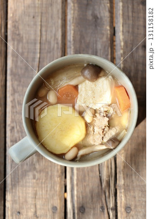 スープカップに入れたサツマイモの具沢山な豚汁