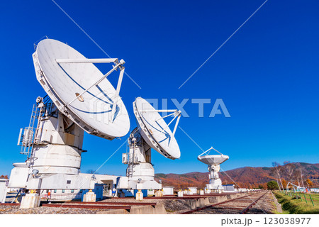 野辺山宇宙電波観測所のパラボラアンテナと八ヶ岳のある風景