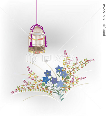 秋の野の草花と虫篭。日本の伝統柄