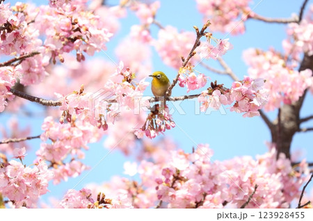 シンプルでフラットなメジロのイラスト 春の訪れ 白背景