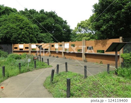 砧公園のバードサンクチュアリと花壇 中央が野鳥観察窓