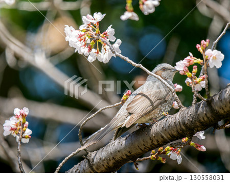 美しいソメイヨシノの間を飛び回って花の蜜を吸う美しいヒヨドリ(ヒヨドリ科)東京都文京区-2024年