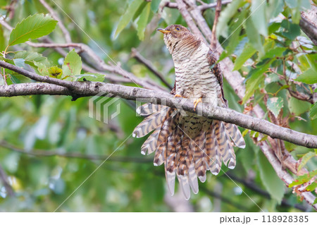 餌を探して梢を飛び回る美しい赤ツツドリ(カッコウ科) 日本国東京都大田区、東京港野鳥公園にて2023