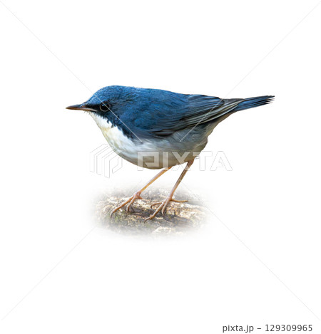Siberian Blue Robin standing on forest ground, displaying its deep blue upperparts and clean white belly in full side profile.