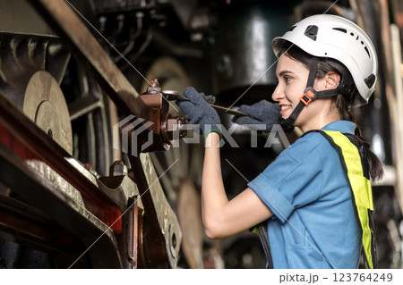 Engineer checking construction process railway and checking work on railroad station
