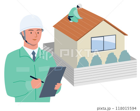 屋根修理の見積もりのために屋根を査定するリフォーム会社員のベクターイラスト