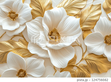 Majestic white and gold floral design with sculpted petals and radiant metallic gold leaves, featuring intricate botanical embellishments in an Art Nouveau-inspired, hyper-realistic composition