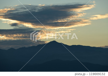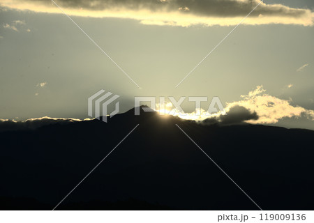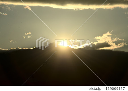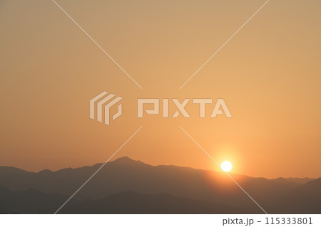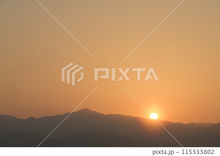 北杜市白州町から見る。東の空を赤く黄金色に染め金峰山の麓から朝日が昇る