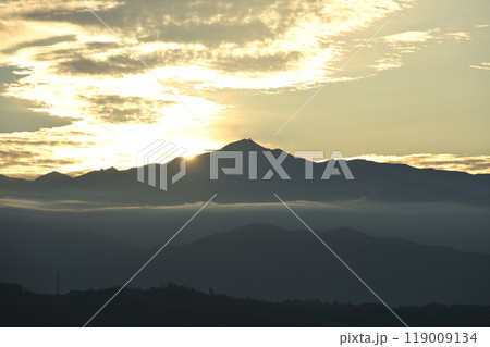 北杜市白州町、金峰山から昇る太陽が空を黄金色に染めて行く