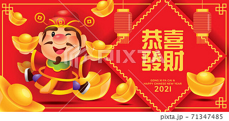 Cute cartoon God of wealth holding gold ingots with gold ingots falling down on Calligraphy paper and lantern. Translation: May you have a prosperous new year.