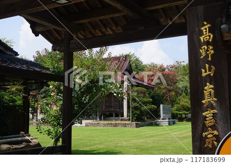 岡山県津山市にある真言宗「新善光寺」:門から百日紅満開の大師堂を見る