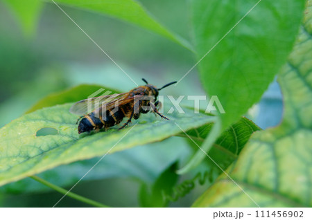 若葉の上で休憩する美しい黄金色の毛に覆われるキンケハラナガツチバチ成虫(自然環境下マクロ撮影)